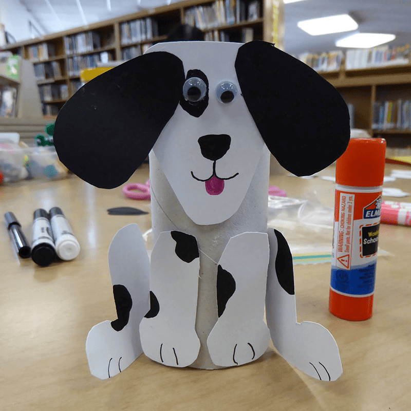 “Each month we choose a different craft theme,” said Tollar. “Emily manages everything with Brian’s help. She designs the crafts, makes samples, provides all of the supplies, and teaches the kids how to do them. All of the crafts are dog themed. Emily has made origami dog bookmarks, dog puppets, paper plate pups, Bingo marker pups, dog themed cards for Mother’s Day and Father’s Day, and lots more. The whole experience for the kids is really positive and engaging. Whether they read, or make a craft, or just want to pet Cooper, they are learning something new, asking questions, being creative, and are excited to be at the library.”