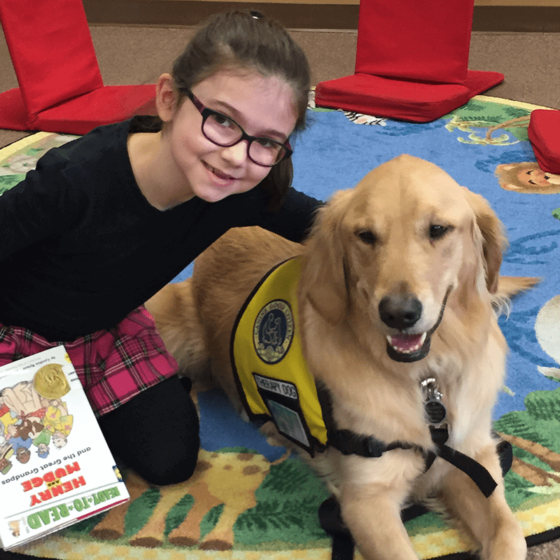 PAWS of CNY volunteer, and organization Vice President Beth Tollar visits Hazard library twice a month with her certified therapy dog, Golden Retriever Cooper. Together, Beth and Cooper sit with the library’s youngest visitors, giving each an opportunity to practice reading out loud to Cooper. Over the past decade, PAWS of CNY’s reading program has been helping kids improve their reading skills by practicing reading out loud to the non-judgmental ear of a loving, certified therapy dog. PAWS of CNY volunteers bring their therapy dogs to 14 schools and libraries across Central New York but at Hazard’s “Paws and Books” program Cooper has earned an unprecedented reputation.